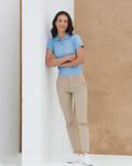 Stretch twill fabric, Slim fit with flat front, Dyed to match buttons, Slanted side pockets, Two single jet back pockets, Back darts for added fit, YKK front zipper and belt loops